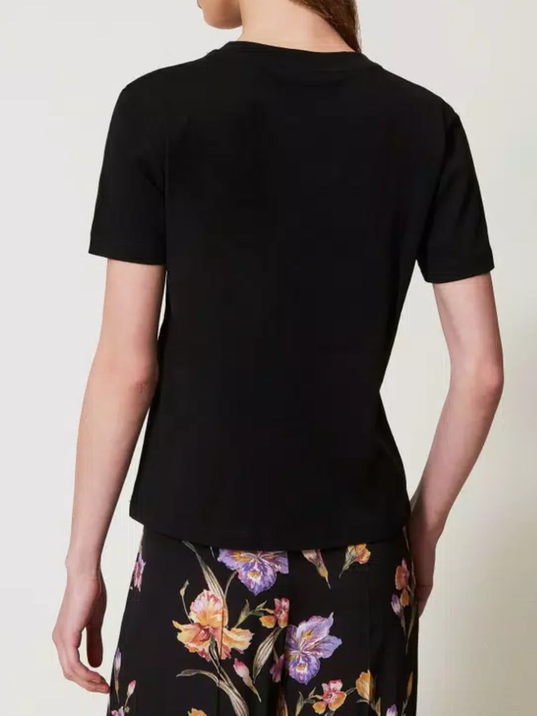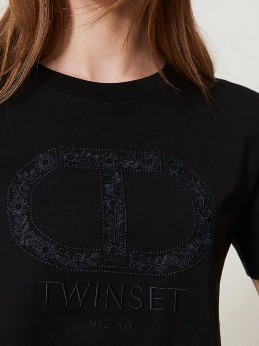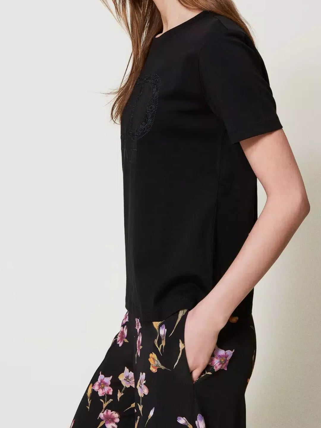 T-shirt in jersey di cotone con ricamo a filo in tinta con grafica Oval T floreale in esclusiva per Twinset. Ha collo tondo, maniche corte, linea regular. DETTAGLI PRODOTTO:
