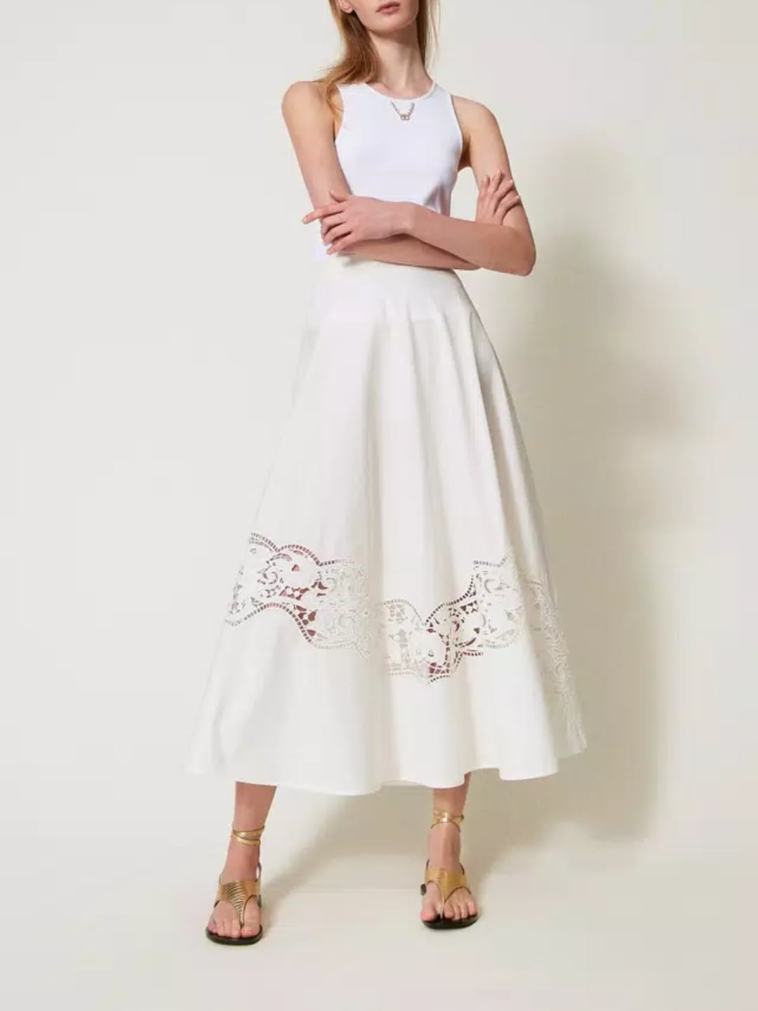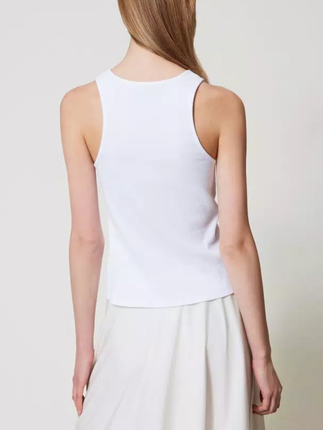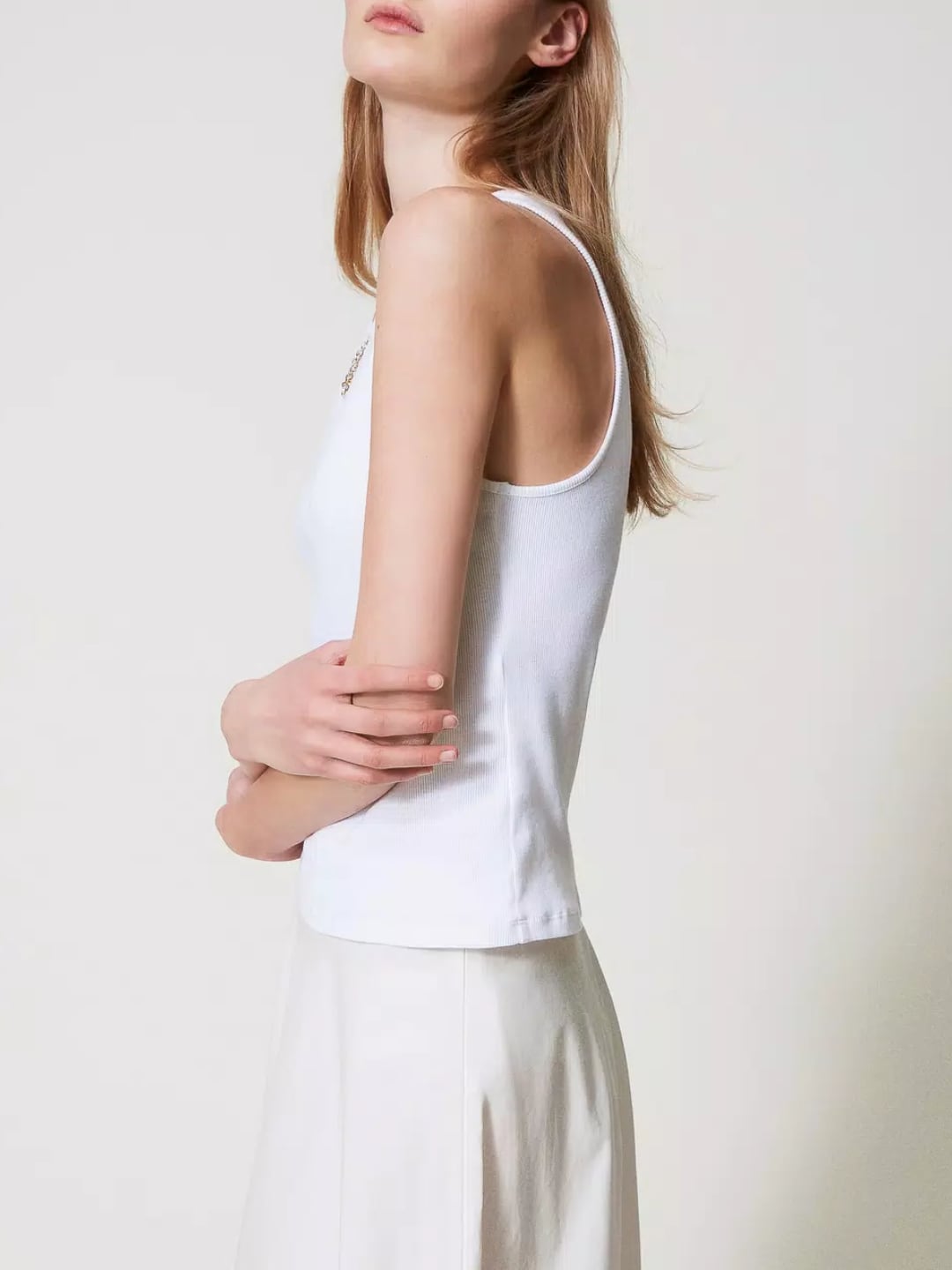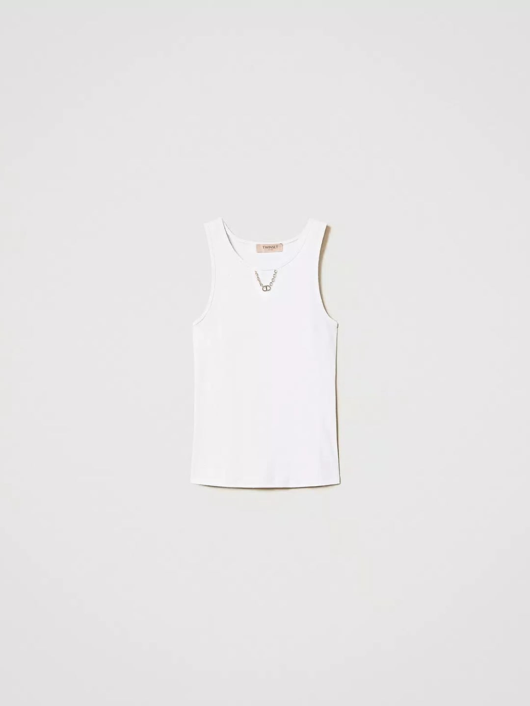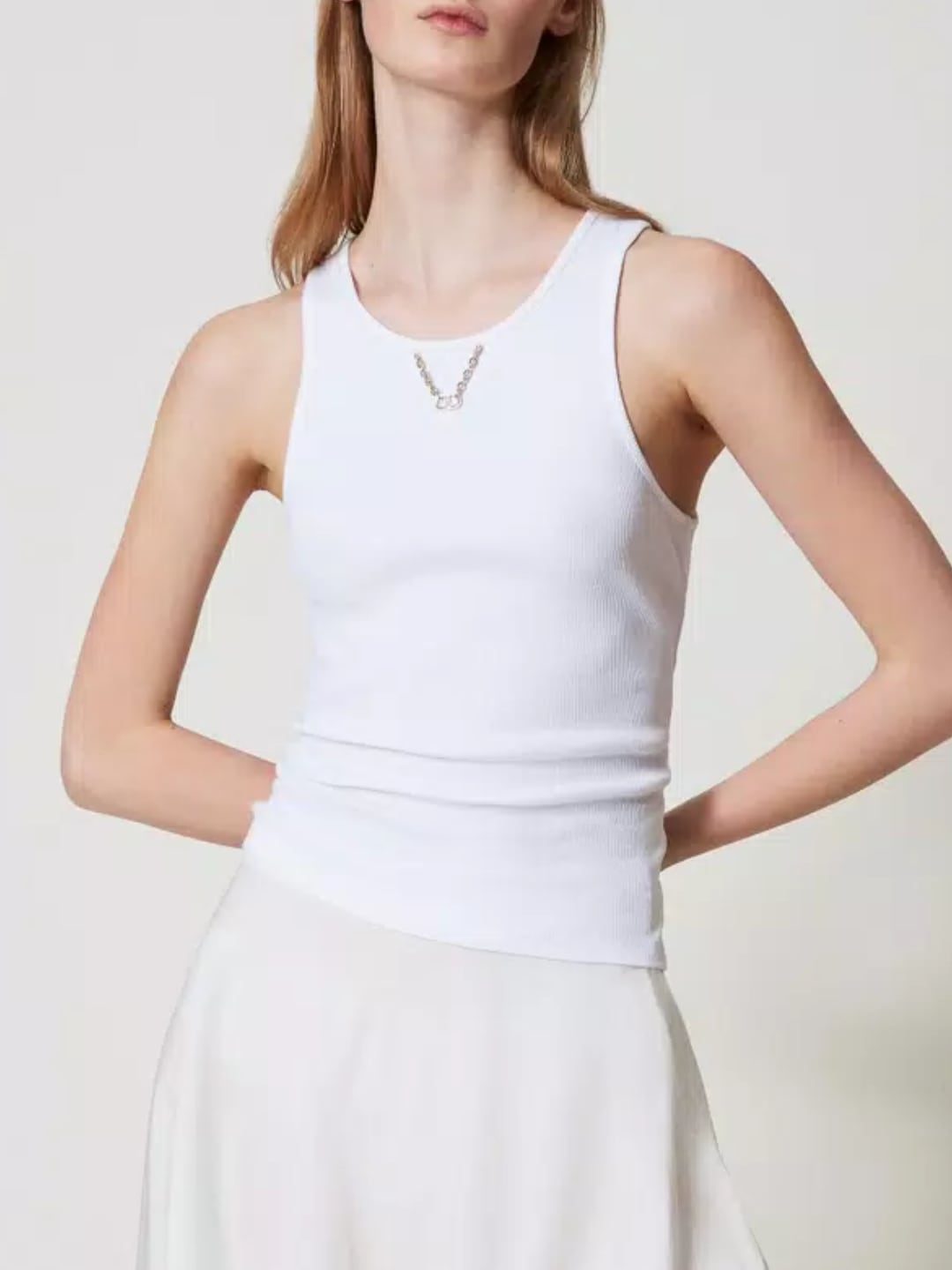 Top in cotone a costine con collo tondo, catena inserita in metallo con logo Oval T e linea fitted. DETTAGLI PRODOTTO: